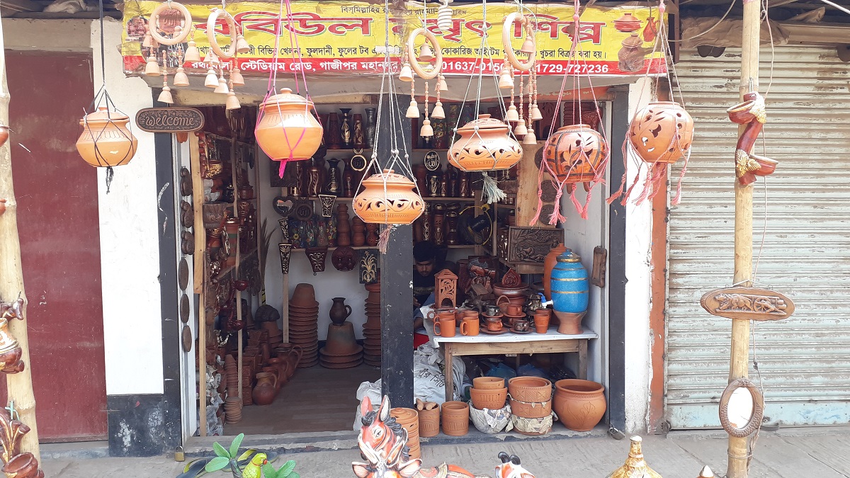 মহানগরের রথ খোলা সড়কে যেতে যে কোন পথচারির চোখ একবারের জন্য হলেও কুটির শিল্পের দোকানে আটকে যাবেই। দোকানের সামনে সুন্দর পরিপাটি সাজানো সামগ্রীতে চোখ বুলালে এমনিতেই মন ভাল হয়ে যায়। দোকানের সামনে সাজানো সুখি গেরস্থ গৃহিনীর প্রতিক শিকেয় মাটির হাড়ি ঝুলানো। হয়ত ওই হাড়িতে এবারও মুড়ি মুড়কি চরবে না। বাঙালির অবস্থার উন্নতি হয়েছে। কিন্তু বাঙালি আনা এখনো ষোলআনা। সরাবছরই মুড়ি মুড়কি পাতে থাকে। বৈশাখে গুড়মাখা মুড়ি মুড়কির কদর বারে। মাটির ব্যাংক, মাটির তৈরী রং-বেরং এর হাতি-ঘোড়া-দোয়েল দেখে ফেলে আসা শিশুকালের স্মৃতি মনে হবে না এমন বাঙালি নেই। মুড়ানো শিতল পাটির মাথায় কৃষকের মাতলা। মাছ ধরা শখের পলো একটার পর একটা সাজানো। গেরস্থ গৃহীনির নিত্যদিনের সাংসারিক পণ্য বাশের ঝাঁকা, উড়া, চালুনি, টাপা, কুলা সবকিছু কেমন বধুর হাতের ছোঁয়ার অপেক্ষায় হাপিত্যেস করছে। আধুনিক অন্দরমহলের কারুকার্যময় মাটির ফুলাদানি। মাটির ফুলের টব বা প্লাস্টিকের টব সবই আছে। আরো আছে পাটের দড়িতে বুনা নবজাতকের দোলনা। বৈশাখ মানেই পান্তা ইলিশ। আর মাটির থালা হলেতো কথাই নেই। মাটির থালা, মাটির গ্লাস, পানি রাখার মাটির পাত্র সবই আছে। মাটির তৈজসপত্রে কারুকার্যময় সৌন্দর্যে ফুটে উঠেছে যেন কুমোড় বধুর মনের রং। ক্ষুদ্র ও কুটির শিল্পের দোকানে চোখ বুলালে বেশ ভাল ভাবেই বুঝা যায় বাঙালির অবস্থা ফিরেছে। কারুকার্যময় ঘর কণ্যার জিনিসে রংএর বাহার। ঐতিহ্যবাহী গেরস্থ সামগ্রীতে আভিজাত্যের ছোঁয়া লেগেছে। তবে করোনাকালে সবকিছুই যেন ম্রিয়মান। সামগ্রীক জীবন চলার পথে সৃষ্টি হয়েছে প্রতিবন্ধকতা। প্রকৃতি কেন এত বিরুপ হলো। সহজ-সরল মাটির সাথে খেলা করা কুমোরও বুঝে উঠতে পারছে না।
